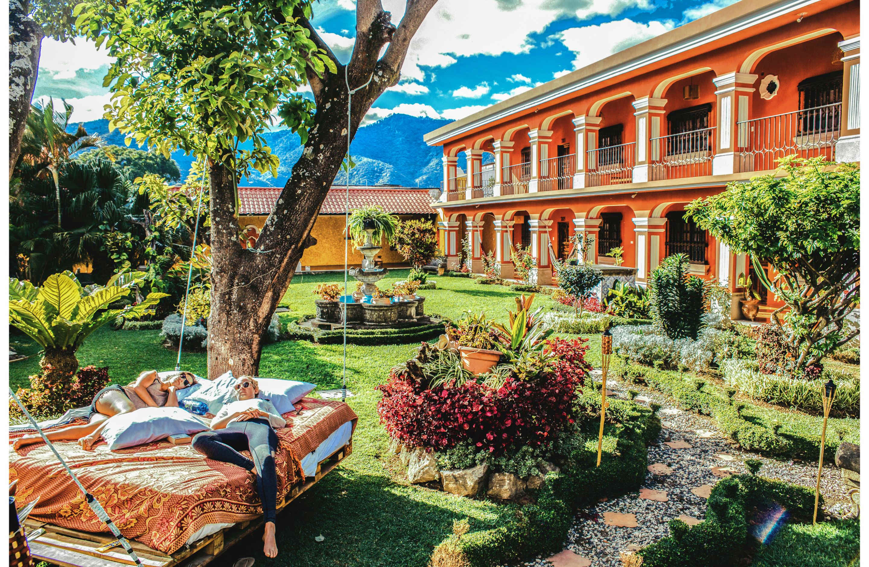 - Stunning garden and pool area with hammocks, outdoor seating, and legitimately beautiful common spaces